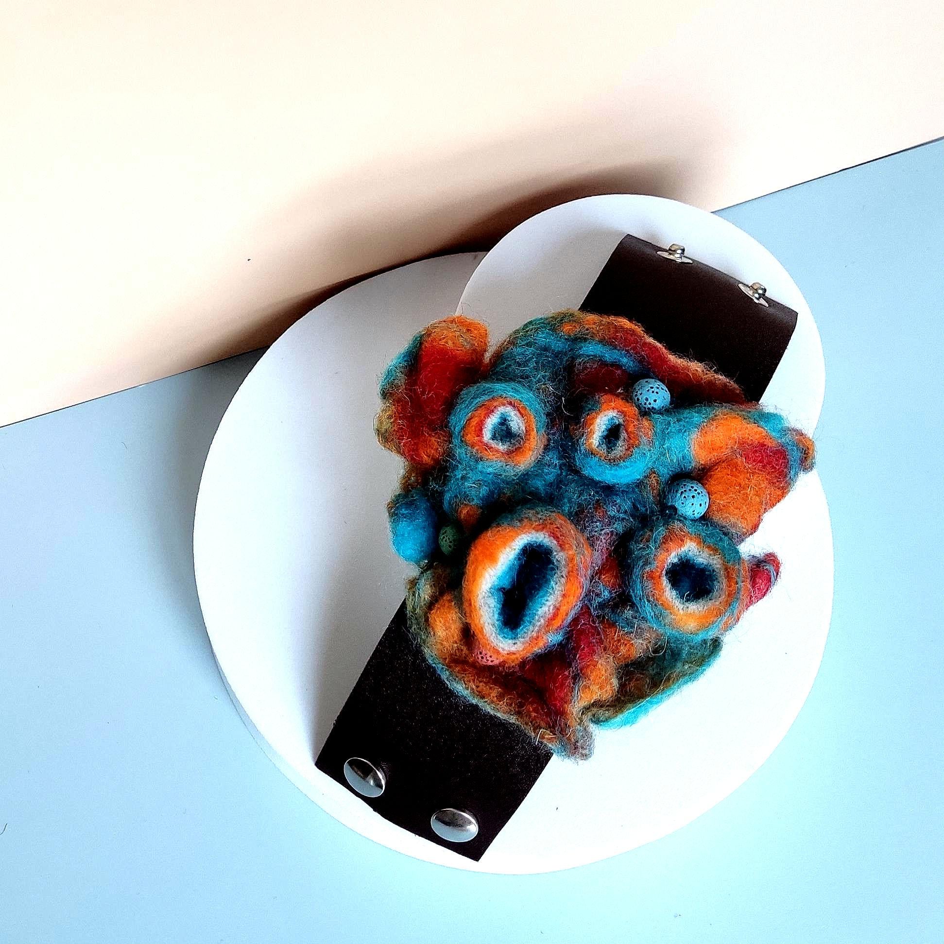 Nadelfilz-Armband – Handgefertigtes, türkisfarbenes abstraktes Design auf Leder, Boho-Schmuck aus mehrfarbigem Filz