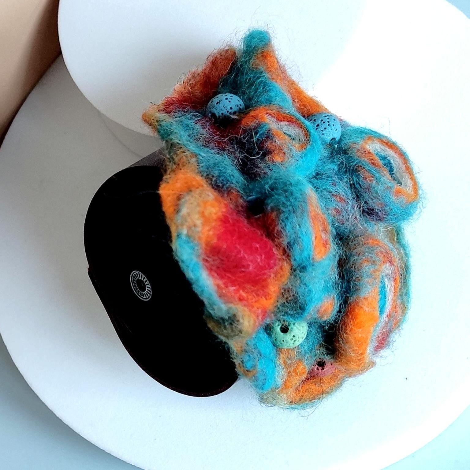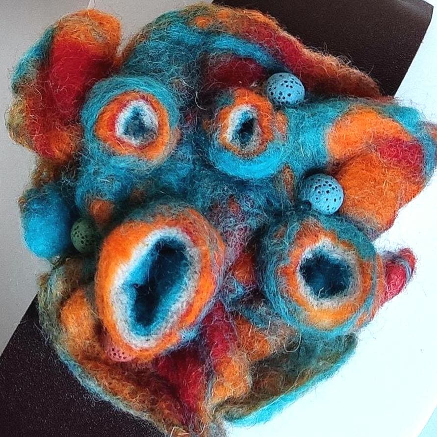 Handgefertigtes Nadelfilzdesign in Türkis- und Orangetönen