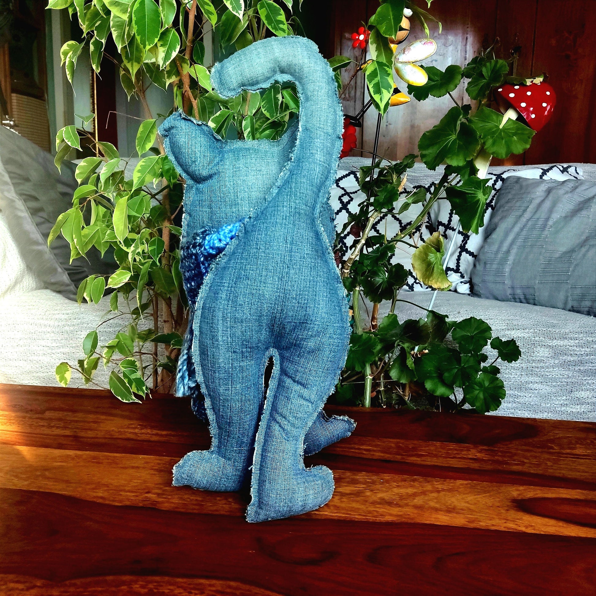 Stehende Katze, Plüschkatze, Kuscheltierkatze, Katze aus blauem Jeansstoff, Geschenk für Katzenliebhaber