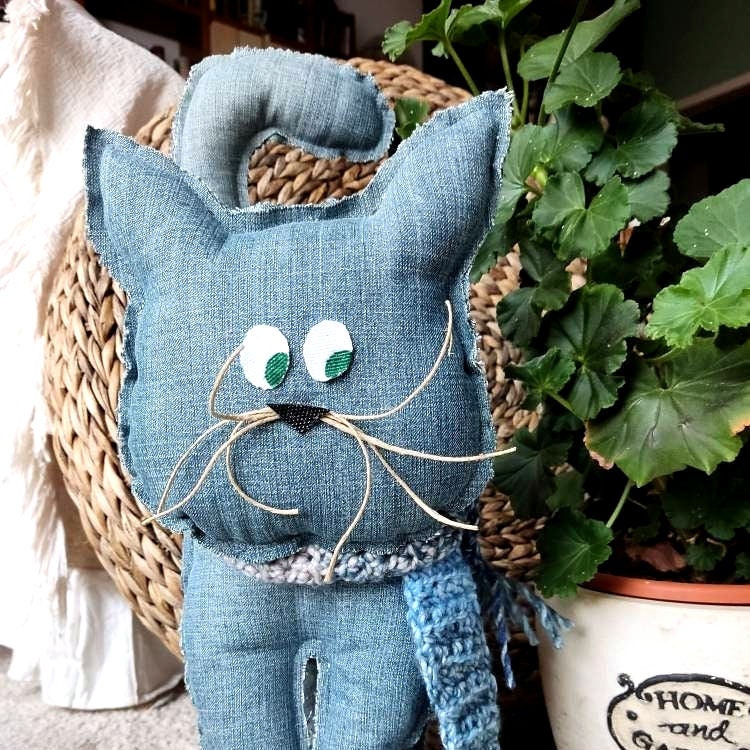 Was für eine süße Katze!!! Sie steht da und schaut voller Neugierde!!! Die Katze kann auf ihren vier Pfoten stehen, hält ihren Schwanz hoch und bleibt ganz still!!!! Sie ist aus Jeansstoff und hat einen gehäkelten blauen Schal um den Hals!