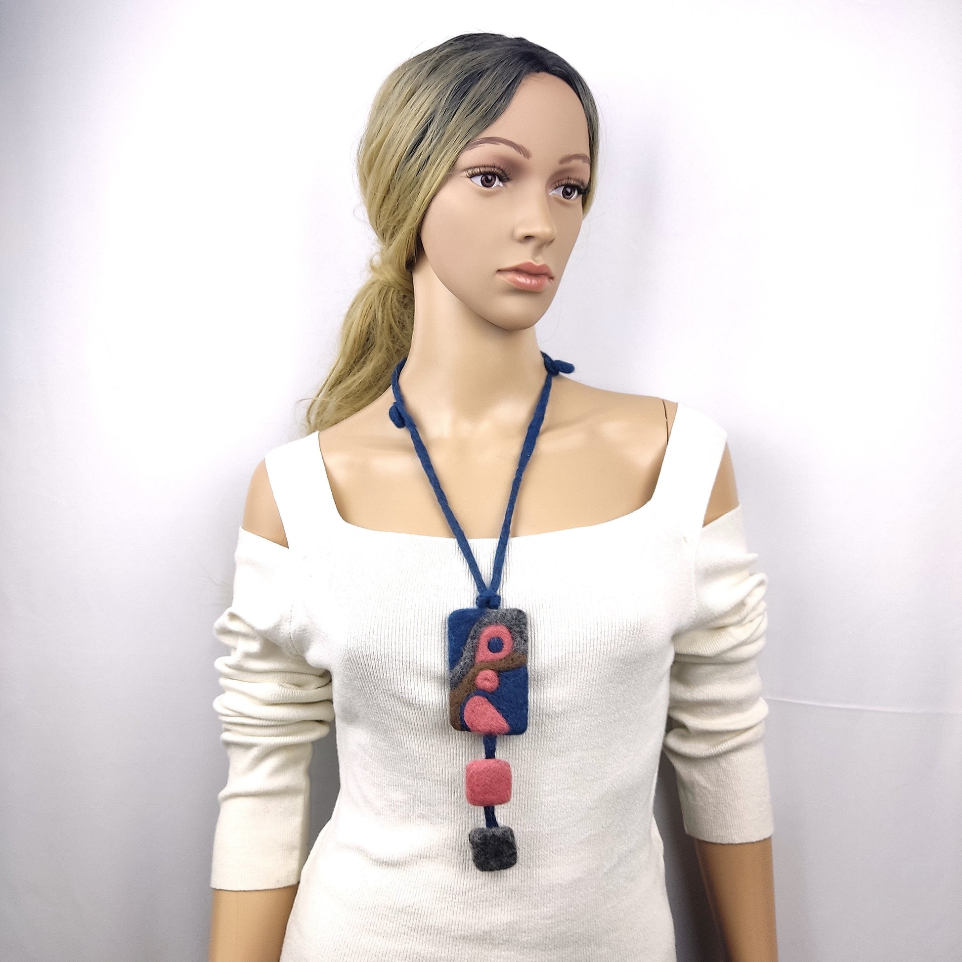 This stunning boho needle felted necklace is a true work of art! Featuring an abstract pendant in beautiful blue and pink tones, this unique piece adds artistic flair and bohemian elegance to any outfit.