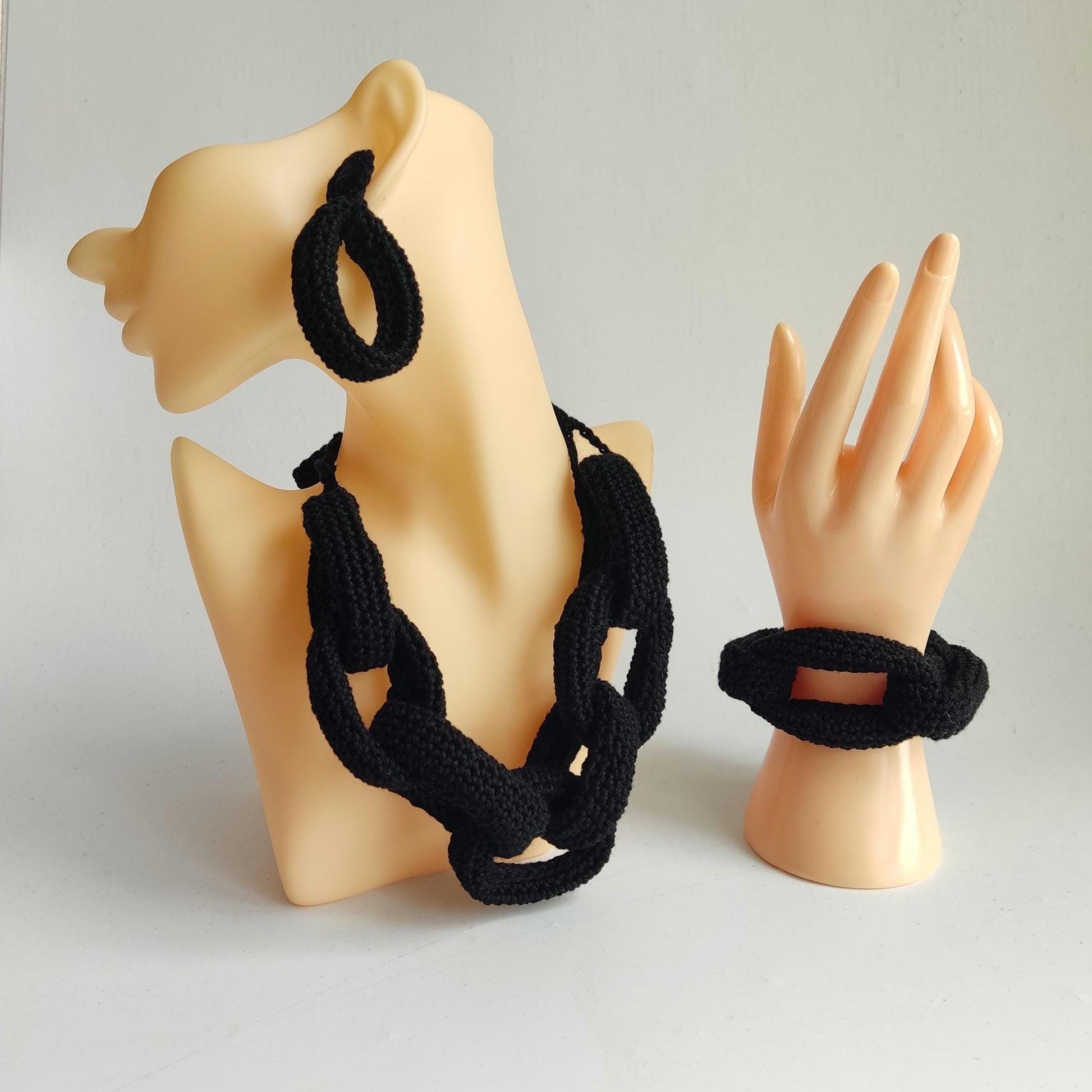 Black Chunky Braided Crochet Necklace - Handmade Cotton Statement Jewelry