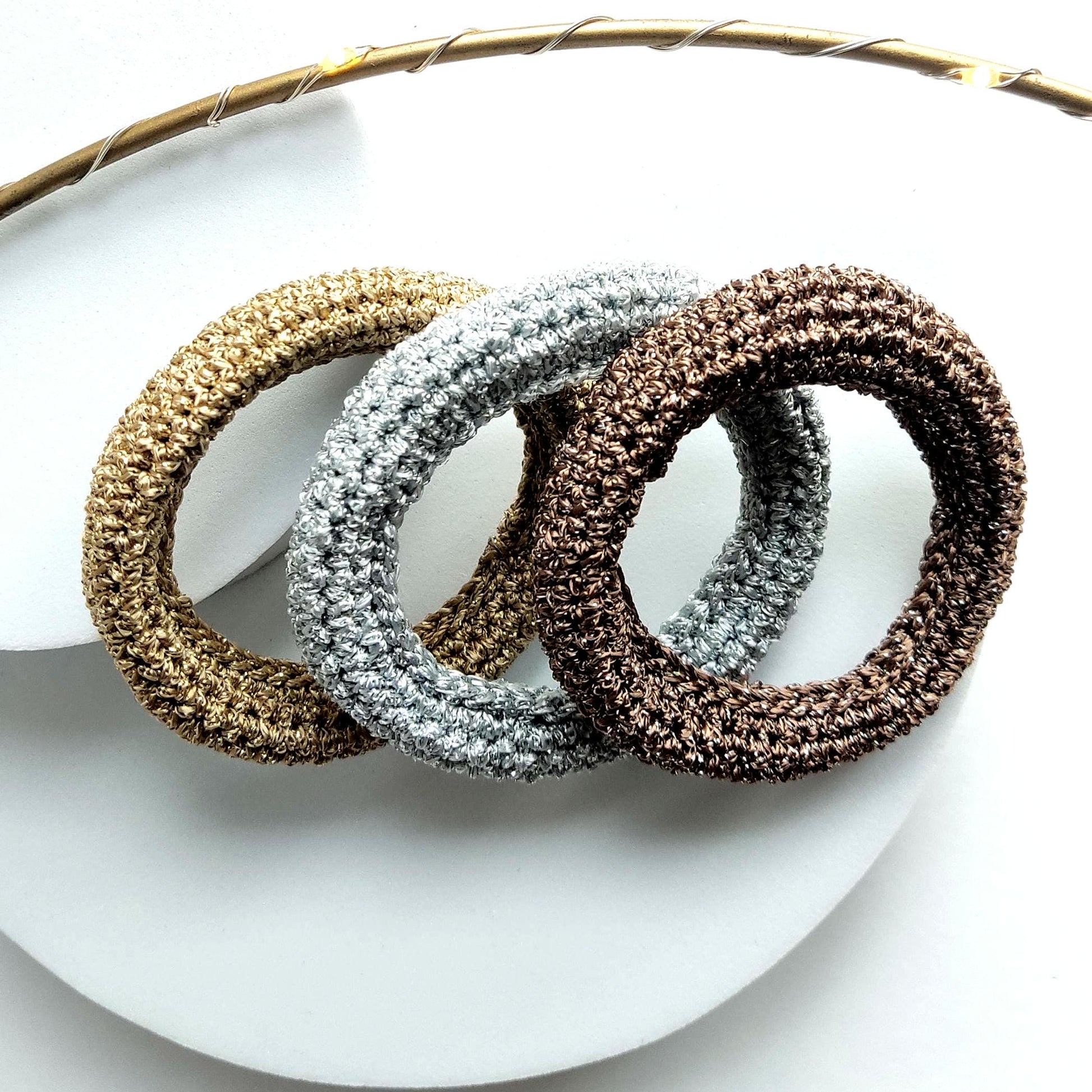 Make a bold statement with this stunning set of three chunky crochet bangle bracelets in luxurious metallic yarn. Each bracelet features a different metallic shade - shimmering gold, sleek silver, and warm bronze - creating a versatile trio that elevates any outfit.
