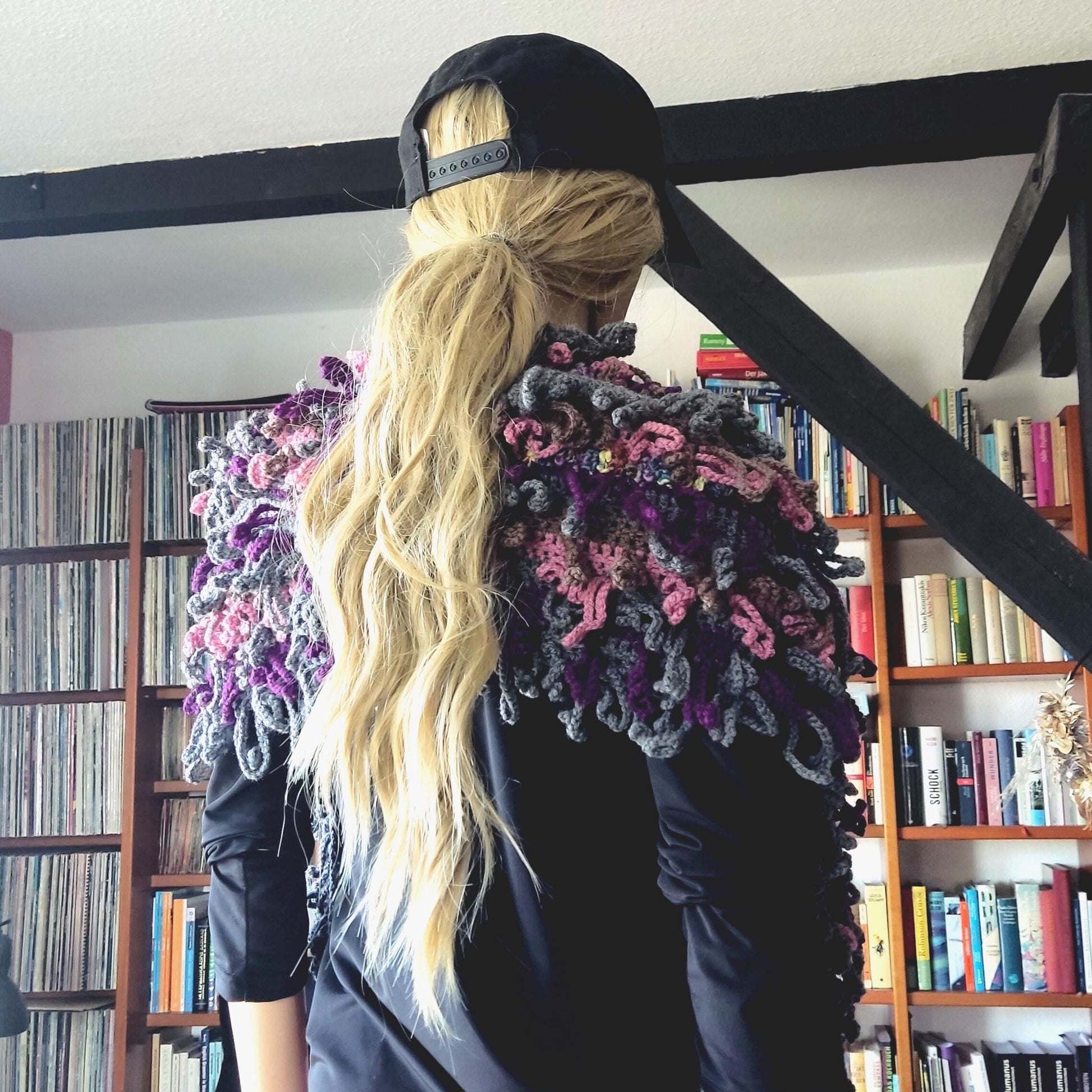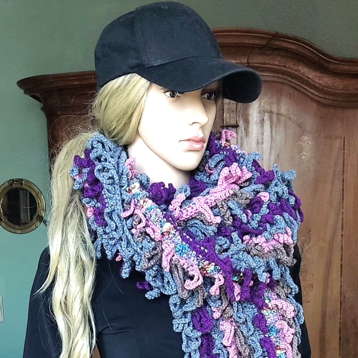 Stay warm and stylish with this stunning chunky crochet scarf featuring beautiful gray, pink, and purple tones. This oversized long scarf is designed to wrap around your neck and shoulders for ultimate warmth and elegance: