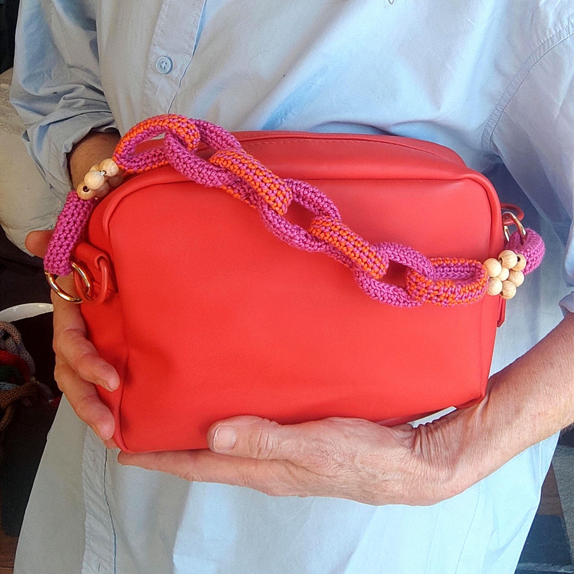 These beautiful handmade crochet purse handles are the perfect way to refresh, customize, or repair your favorite handbag. Crafted with premium cotton yarn in a stylish colorful chain design and adorned with charming wooden daisy embellishments, these replacement bag straps add a unique handmade touch to any purse. Perfect for DIY handbag projects or giving new life to an old favorite!