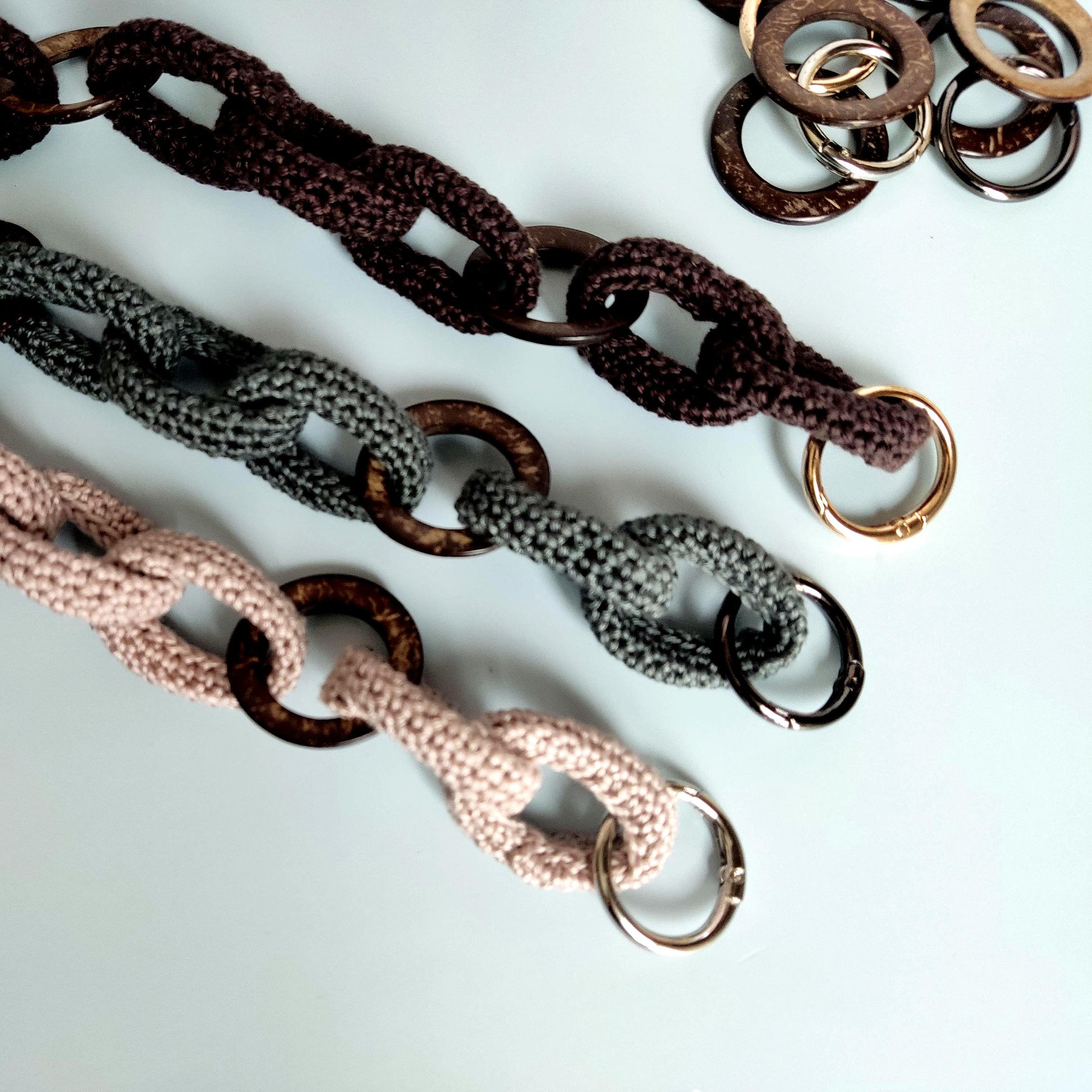 - Unique design combining crochet and natural wood rings