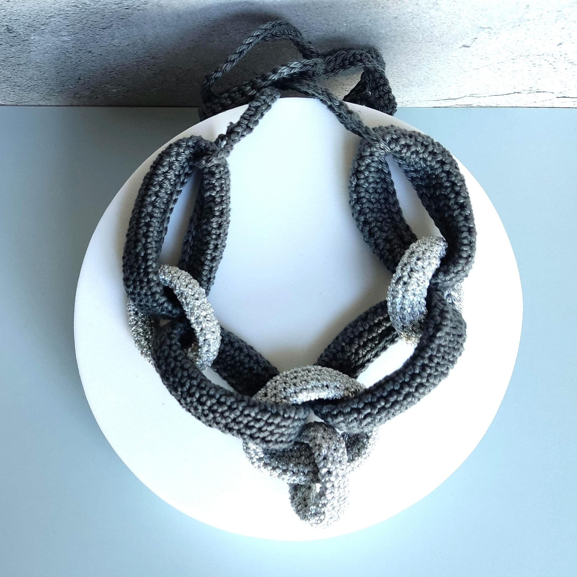 This exquisite handmade chunky crochet necklace in elegant gray silver is the epitome of refined luxury. Featuring a stunning braided chain design with a lustrous silver sheen, this statement piece brings sophisticated glamour and artistic elegance to your wardrobe. Perfect for the woman who appreciates the finer details in life.