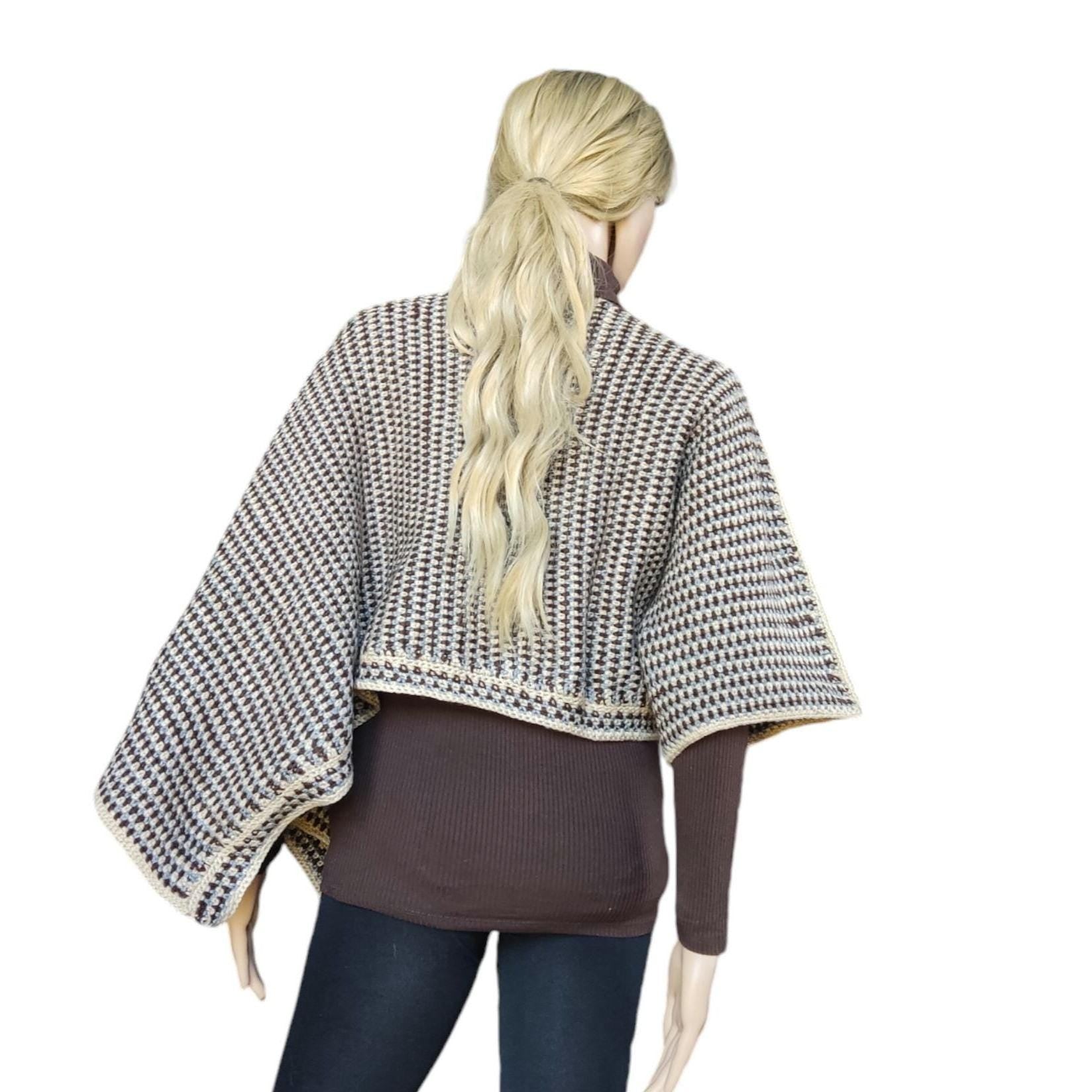 Crochet Crop Top Sweater - Brown Beige Striped Poncho with Wide Sleeves