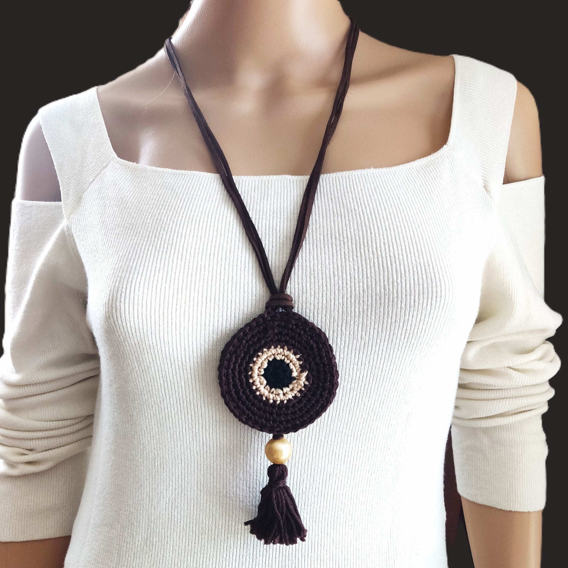 Chocolate Brown Crochet Evil Eye Pendant Necklace - Boho Tassel Leather Strap, Protection Jewelry