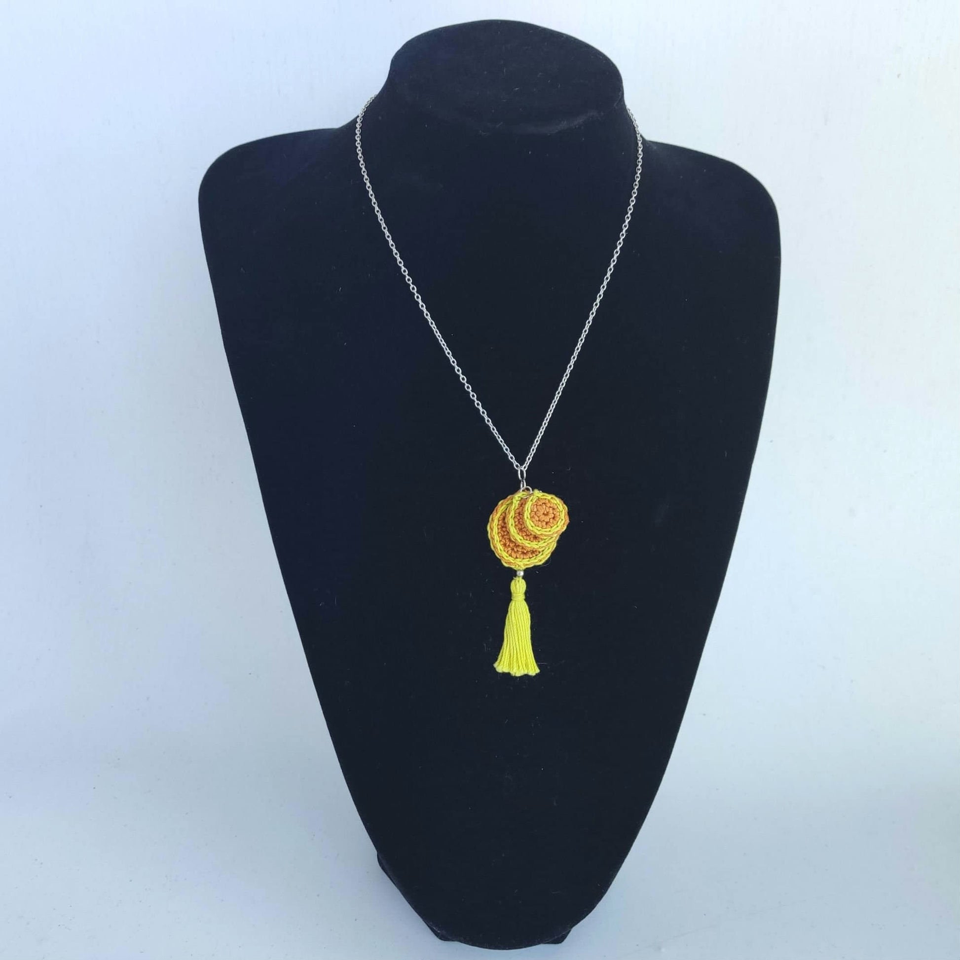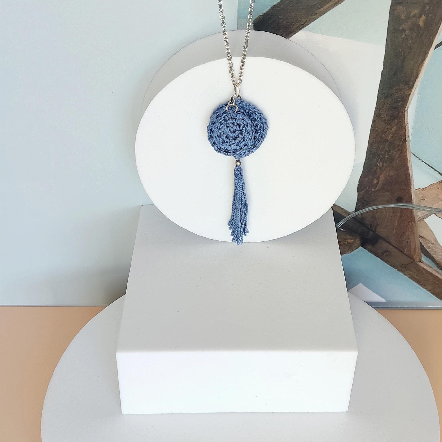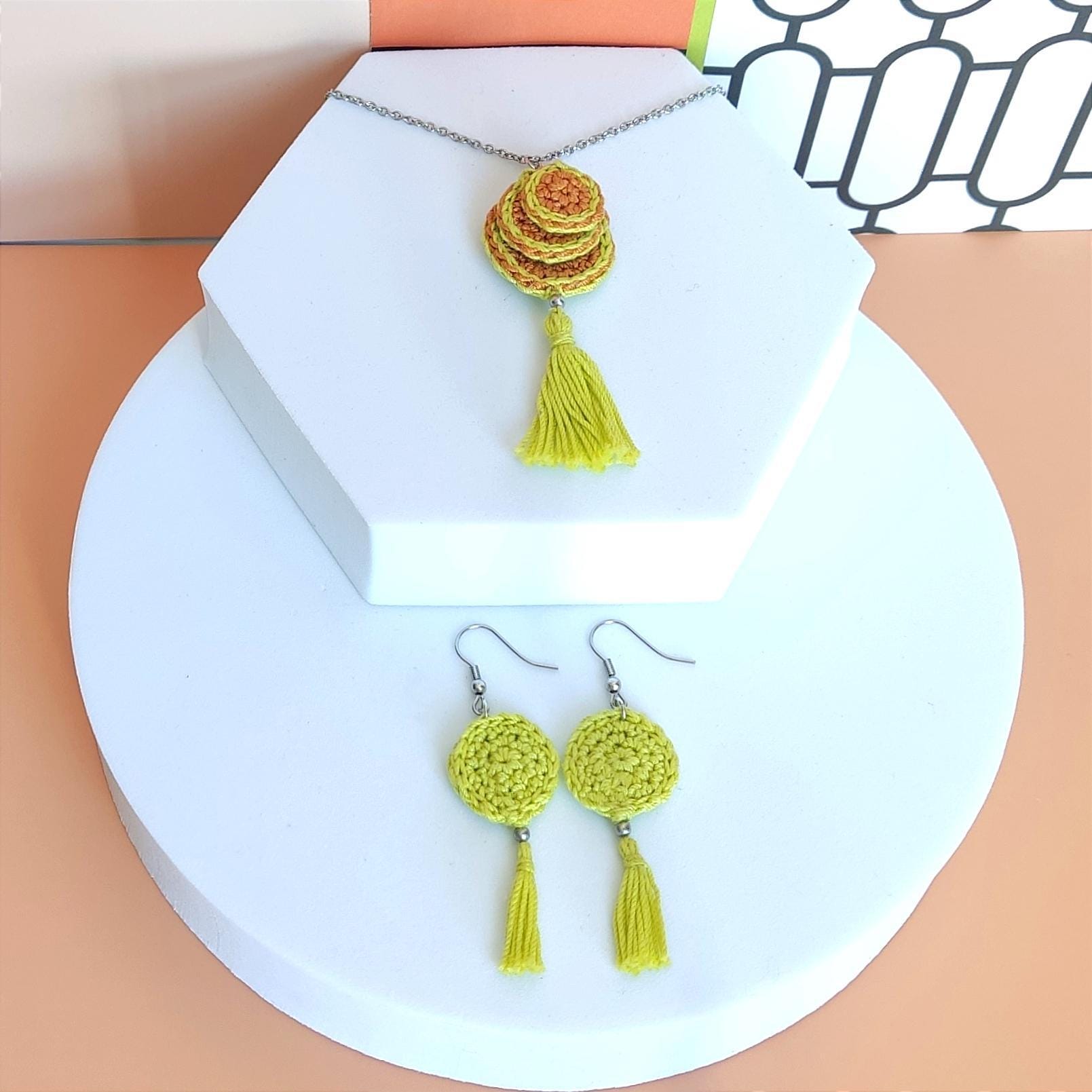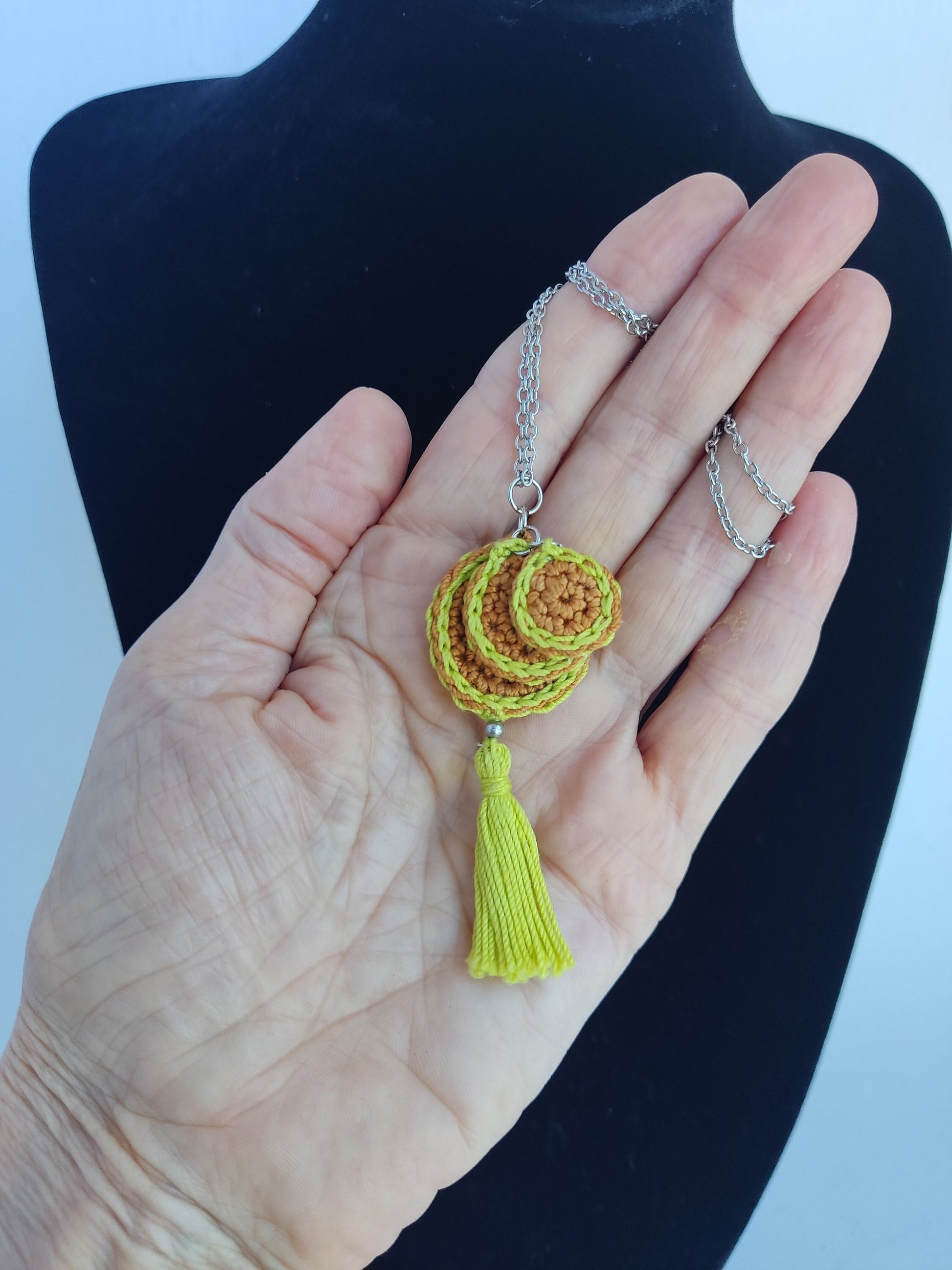 This beautiful handmade crochet pendant necklace combines warm brown and fresh green tones for a natural, earthy aesthetic. Featuring a delicate tassel design and modern bohemian style, this versatile piece brings organic beauty and artistic charm to your everyday wardrobe.
