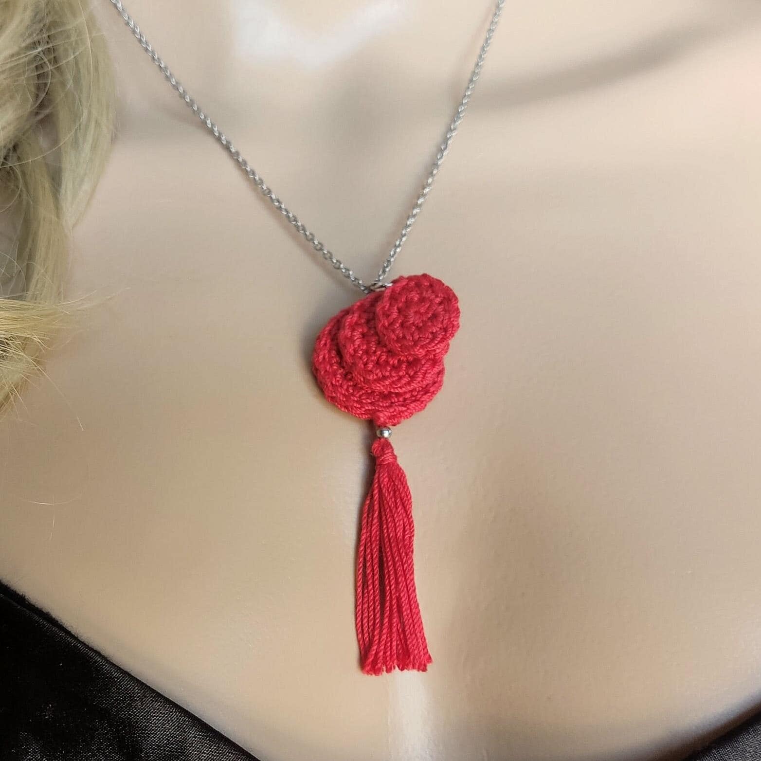 Red Crochet Pendant Necklace - Handmade Boho Tassel Statement Jewelry