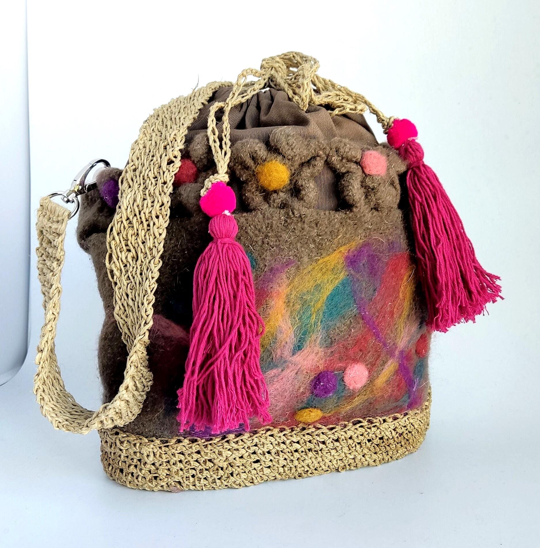 This unique felted bucket bag makes a perfect present for anyone who loves handmade accessories, bohemian style, nature-inspired design, or unique artisan pieces. Ideal for birthdays, Mother's Day, or special occasions!