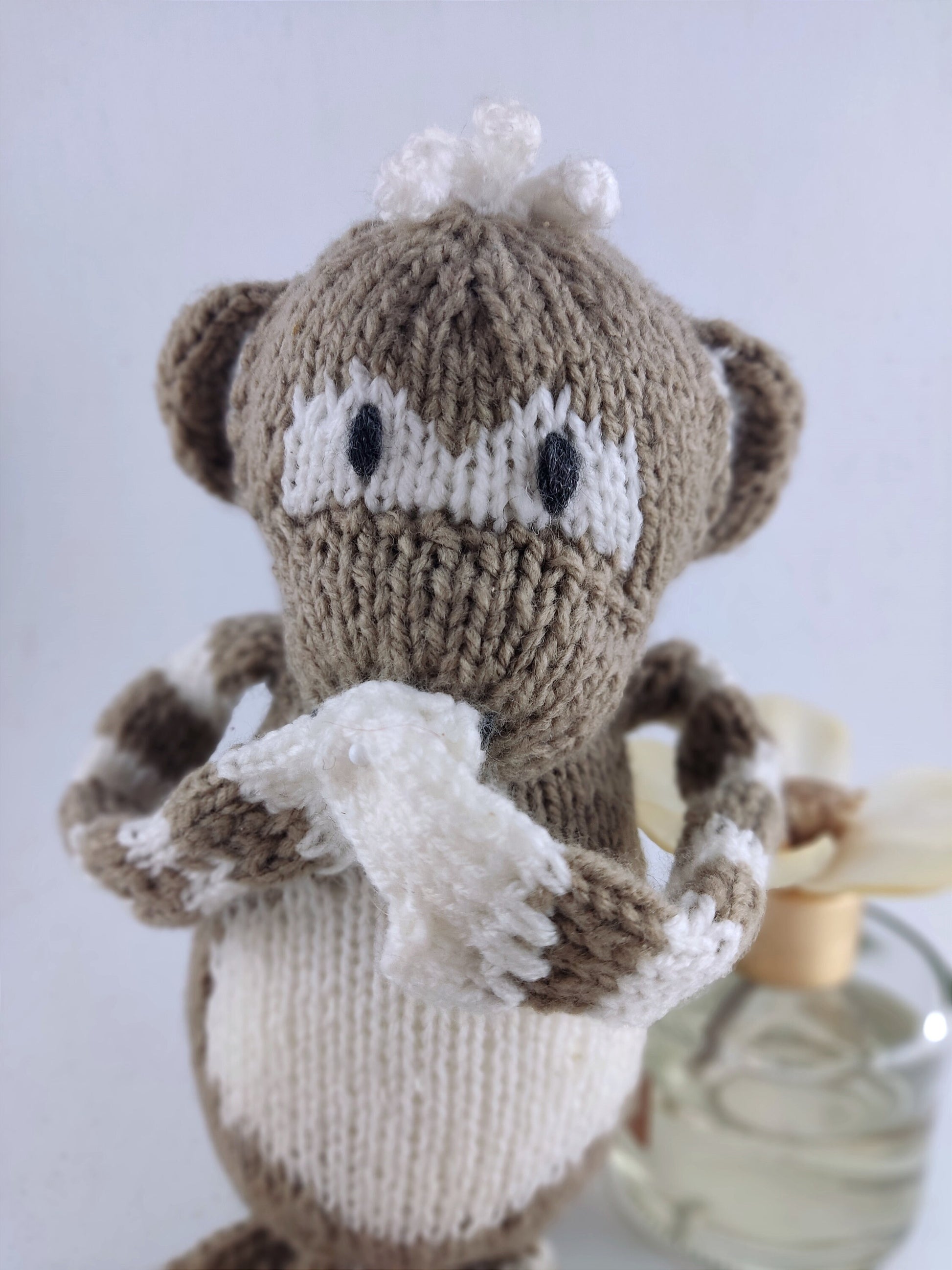 This is a cute knitted little monkey with a happy smiling face, soft and flexible.